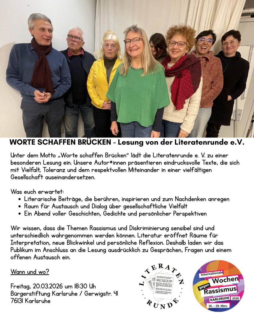 Unter dem Motto „Worte schaffen Brücken“ lädt die Literatenrunde e. V. zu einer besonderen Lesung ein. Unsere Autor*innen präsentieren eindrucksvolle Texte, die sich mit Vielfalt, Toleranz und dem respektvollen Miteinander in einer vielfältigen Gesellschaft auseinandersetzen.