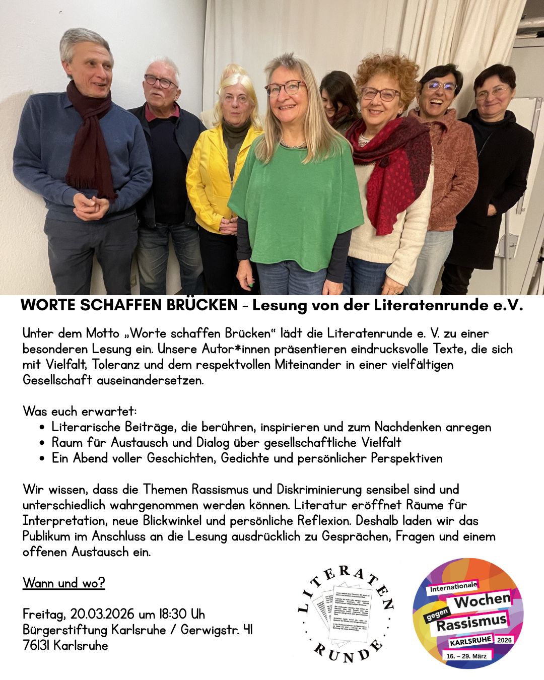 Am 18. März 2025 fand unsere literarische Lesung „Worte schaffen Brücken“ im Rahmen der Internationalen Wochen gegen Rassismus Karlsruhe 2025 statt. Zum dritten Mal durften wir als Gäste im Umweltzentrum Karlsruhe unsere Texte vortragen – und der voll besetzte Saal hat uns überwältigt!